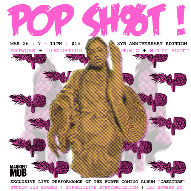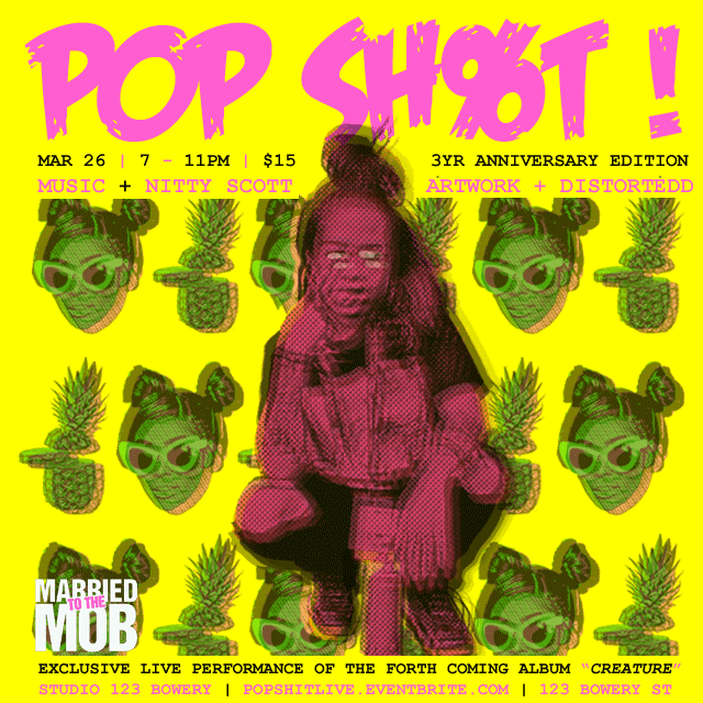 POP SH%T AND MARRIED TO THE MOB PRESENT: NITTY SCOTT x DISTORTEDD at Studio 123 Bowery on March 26th! Nitty Scott will be performing unreleased music off her forthcoming CREATURE! album, a celebration of “Afro-Latina girl magic”, culture and intersectionality. Visual artist Distortedd will be in the building exhibiting exclusive pieces and animation, as well as live art! Curated by Boris Bernard. Come and get a healthy dose of audio and visual substance, POP SH%T style.